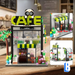 La façade entièrement vitrée, soulignée par un magasin rayé vert et jaune, laisse entrevoir un intérieur accueillant : une vitrine garnie de pâtisseries, un coin salon avec une tasse de café fumant posée sur la table, et un petit comptoir aménagé comme dans un véritable coffee shop de quartier. À l'extérieur, quelques plantes et une ardoise affichent les suggestions du jour, comme dans un café de centre-ville où l'on vient s'attabler entre amis ou bouquiner l'après-midi.