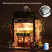 Un kit lumineux est intégré, alimenté par une brique à piles discrètement. Les guirlandes suspendues s'éclairent et donnent vie à la scène, faisant ressortir la verrière atelier de l'ensemble à la tombée de la nuit.