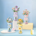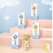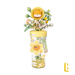 Le tout repose dans un vase (cup) transparent rempli de petites perles dorées qui captent la lumière et renforcent l’aspect décoratif du modèle. Le couvercle jaune et les petites étiquettes illustrées complètent l’esthétique douce et colorée de la composition.