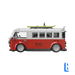 L’esprit du bord de mer, version briques, ce Van capture toute l’énergie rétro des routes ensoleillées et des étés sans fin. Avec son design arrondi, son toit blanc contrastant et sa planche de surf fixée sur le toit, ce van miniature est une véritable invitation au voyage.